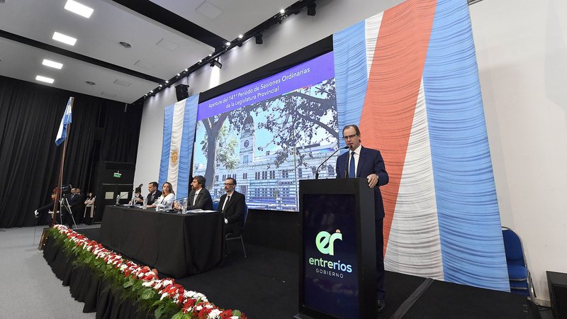 Acompañado por la vicegobernadora, Laura Stratta, y por el presidente de la Cámara de Diputados, Ángel Giano, el mandatario hizo referencia al contexto mundial y nacional, asegurando que aún así “es posible para Entre Ríos sentar bases sustentables”, señalando que es necesario para ello el “trabajo, creatividad e ingenio de todos”. Realizó luego un pormenorizado análisis de la situación de la provincia, manifestando que la sustentabilidad sería el concepto central de las políticas de esta nueva gestión.