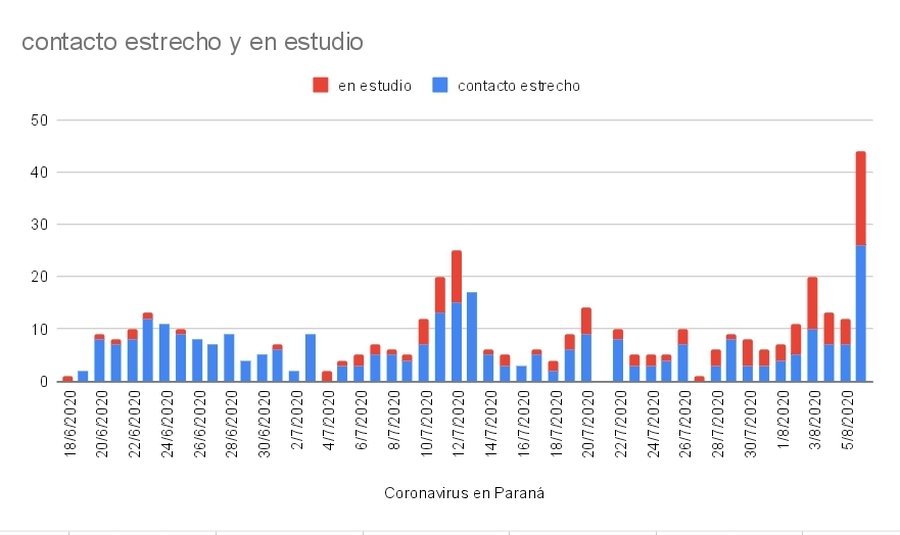 De total, 49 casos fueron detectados en el Departamento Paraná, 44 corresponden a la ciudad capital, de los cuales 26 tuvieron contacto estrecho con casos confirmados previamente y 18, sus nexos epidemiológicos se encuentran en estudio. De los restantes confirmados, 2 pertenecen a la localidad de Viale, 2 a San Benito y 1 a Colonia Avellaneda; de todos ellos sus respectivos nexos epidemiológicos se encuentran en investigación.
