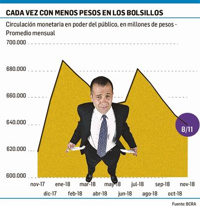 El BCRA se ha comprometido a una pauta de crecimiento cero de la base monetaria hasta junio 2019. Claro que esto no significa que no se emita nada, sino que si el BCRA emite debe esterilizar el 100% (o sea, aspirar todo lo emitido). Luego la base crecerá 1% mensual hasta diciembre 2019.Ahora bien, el derrumbe de los principales agregados monetarios, como el circulante (billetes y monedas) en poder del público y el M3 (el circulante más los depósitos privados), será una pesada mochila para cuando el Gobierno aspire a caminar en un sendero de reactivación. Según los datos oficiales la circulación en poder del público orilla los $640.000 millones. En lo que va del año se registra una caída de más de $55.800 millones.