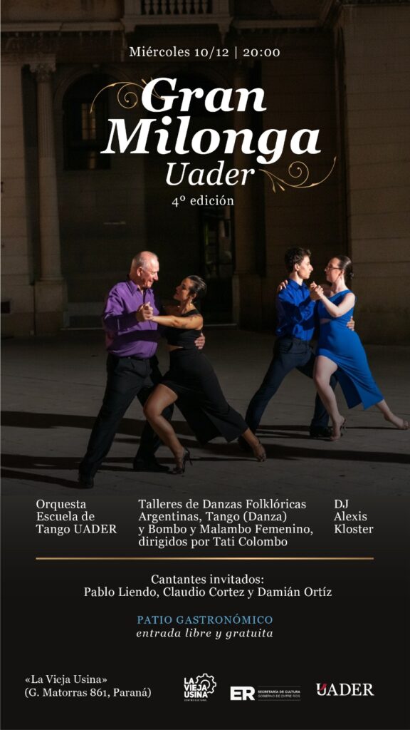 El miércoles 10 de diciembre, desde las 20:00, se realizará la Gran Milonga UADER – 4ª edición en La Vieja Usina (G. Matorras 861, Paraná). La propuesta, organizada desde el ámbito cultural de la universidad, llega con una noche completa de tango, folklore y actividades abiertas al público.