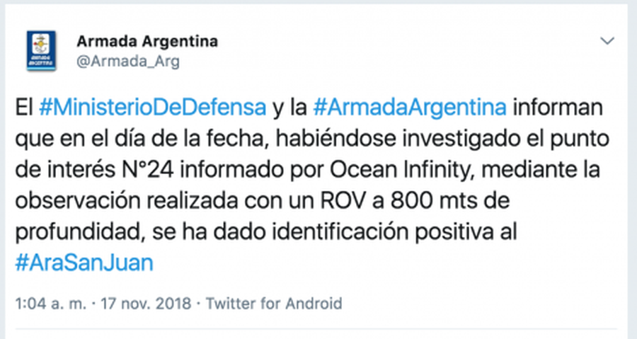 La Armada publicó cerca de la medianoche un escueto comunicado donde se daba cuenta del encuentro del buque. “El Ministerio de Defensa y la Armada Argentina informan que en el día de la fecha habiéndose investigado el (Punto Dato) POI 24 informado por la empresa Ocean Infinity, mediante la observación realizada con un ROV (vehículo de observación remota) a 800 metros de profundidad, se ha dado identificación positiva al submarino ARA ‘San Juan'”.
