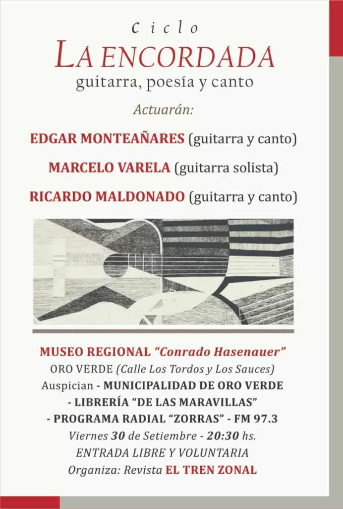 El Museo Conrado Hasenauer recibirá al Ciclo “La encordada. Guitarra, poesía y canto”. Será este viernes 30 de septiembre a las 20.30 hs en su edificio, ubicado en Los Tordos 241.