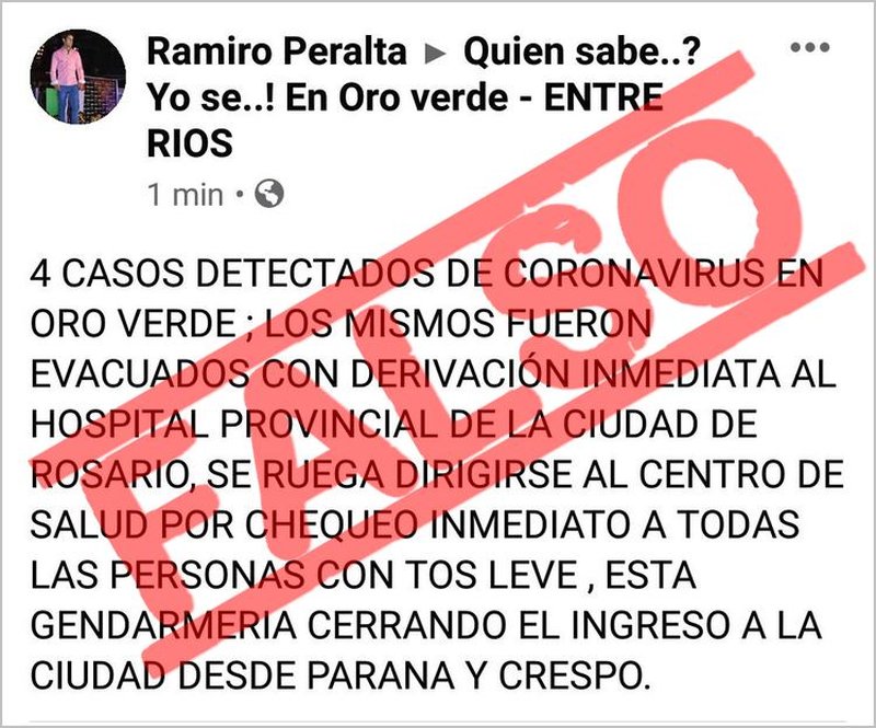 En las últimas horas comenzaron a circular en diversas redes sociales publicaciones que contienen información falsa vinculadas a la enfermedad que este miércoles fue declarada pandemia por la Organización Mundial de la Salud. Uno de los textos virales cita la existencia de “personas evacuadas por coronavirus en la ciudad de Oro Verde” y a la “presencia de Gendarmería cerrando los ingresos a la ciudad desde Paraná y Crespo”.
