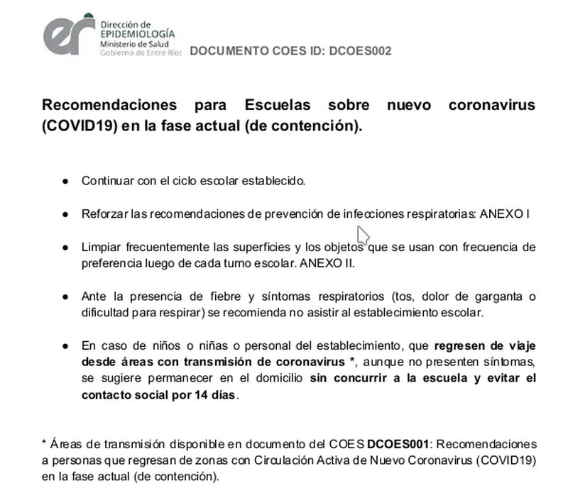 El Protocolo nacional que aplican todas las provincias, incluida Entre Ríos, en ningún renglón contempla el cierre de instituciones ante la presentación de un caso sospechoso de coronavirus.