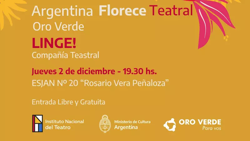 En el marco del programa “Argentina florece” llega a Oro Verde la obra de teatro “Linge!” a cargo de la Compañía Teastral. Será en la ESJA Nº 20 “Rosario Vera Peñaloza” (Av. Los Chañares 271) el jueves 2 de diciembre a las 19:30 hs. La entrada es libre y gratuita, y abierta a todo público.