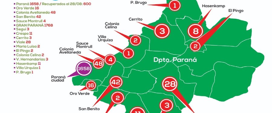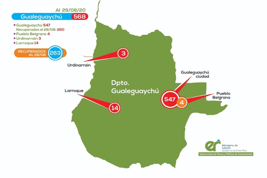 Entre Ríos integra, junto a Capital Federal, Buenos Aires, Chaco, Jujuy, Mendoza, Neuquén, Río Negro, Salta, Santa Fe, La Rioja, Santa Cruz, Santiago del Estero y Tucumán, el grupo de provincias con ciudades con circulación comunitaria sostenida.